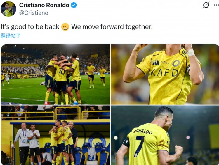 赛后,C罗在社交媒体上谈论了自己的感受,他写道:很高兴能够复出,我们一起携手前行!